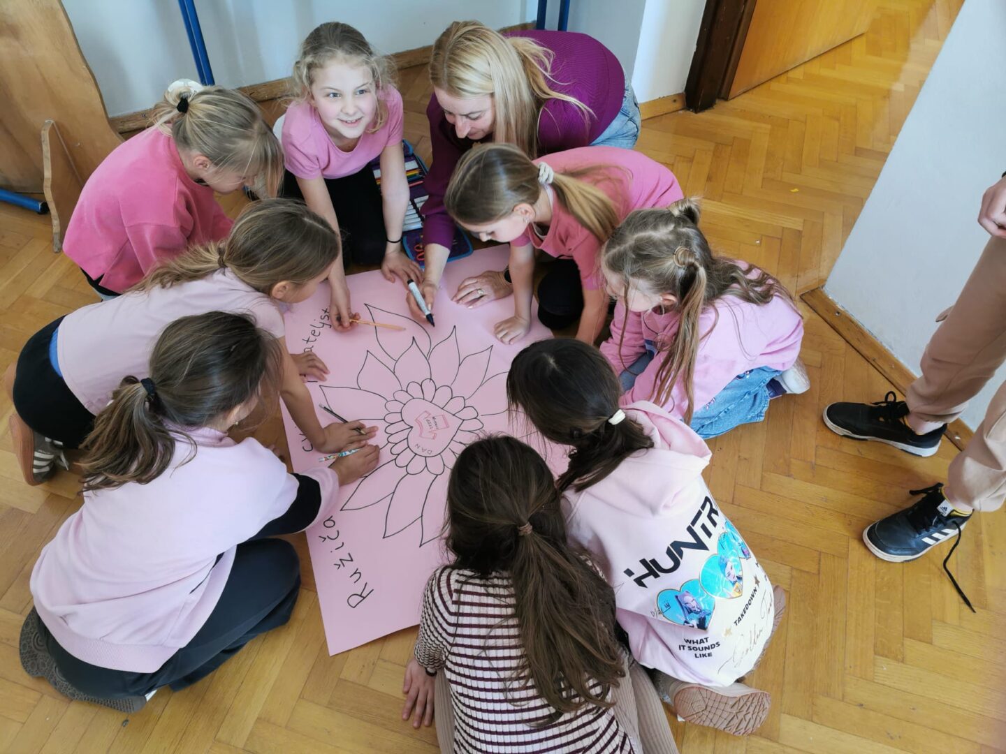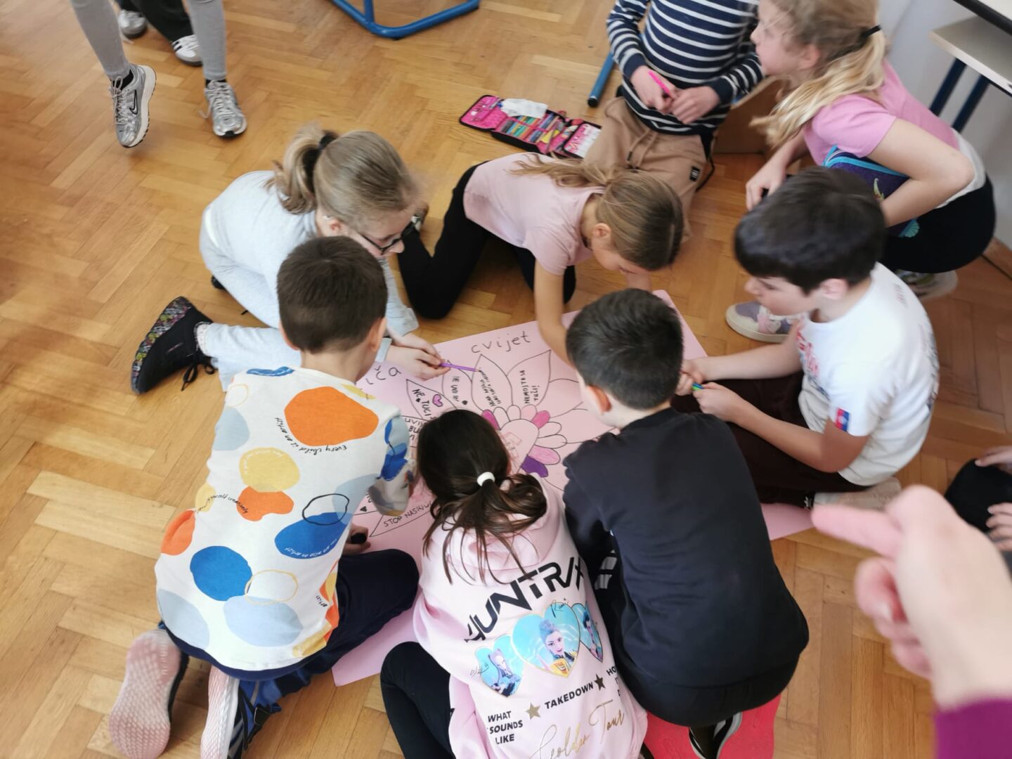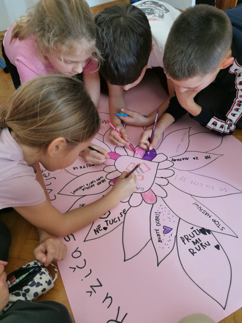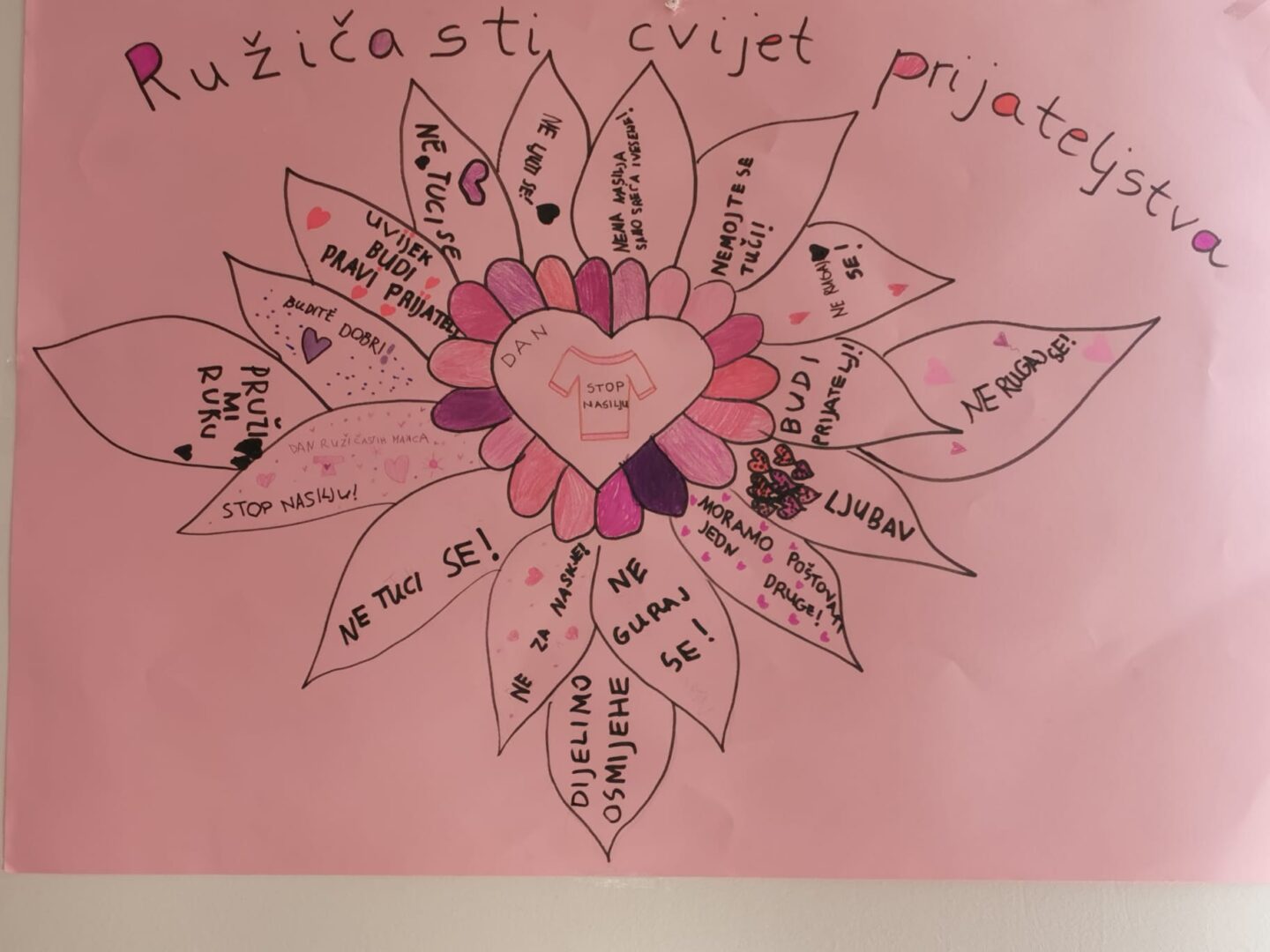 Zajedno smo izradili plakat Cvijet prijateljstva. Svaka latica našeg cvijeta nosi poruku tolerancije i nenasilja.